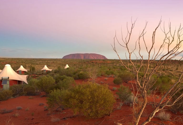 Tents facing Uluru, endless land in every direction. You feel small in the best possible way — untethered and fully present.