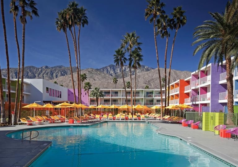 A rainbow-colored hotel made for sunshine, pool floats, retro bikes, and late mornings. Bright walls, music by the pool, and zero pressure to be polished.