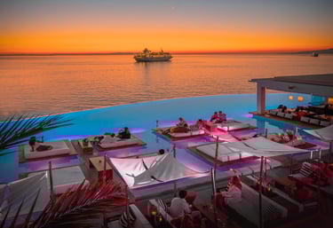 White curves, infinity pools, and glowing sunsets — one of the most emotionally magnetic summer visuals in Europe.