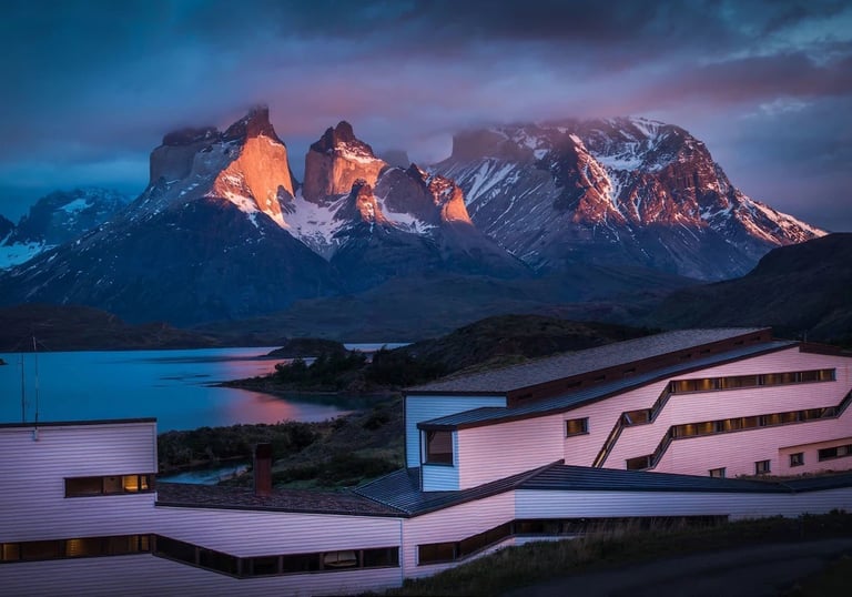 A historic alpine lodge buried in snow each winter — steep roofs, deep drifts, fireplaces, and classic winter imagery built around the season.