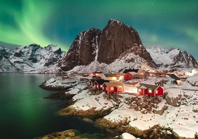 Red fishing cabins set against snow-covered peaks and Arctic seas — dramatic winter scenery without luxury gloss.